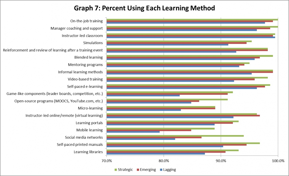 As Graph 7 shows, Strategic organizations make greater use of mobile learning and blended learning than Lagging and Emerging organizations do. In addition, we unexpectedly found that Strategic organizations also make greater use of learning methods that tend to be low cost or free. For example, Strategic organizations make greater use of social media networks and open-source content than do either Lagging or Emerging organizations, despite the fact that both can be accessed with almost no cost.