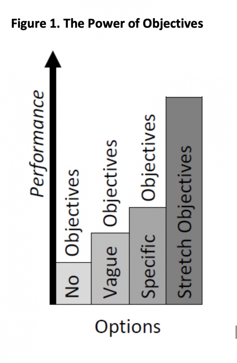 Figure 1 below summarizes the research. If you have no objectives, you will have some performance, but usually not much. You will have more results if you develop vague objectives such as “decrease turnover with critical talent” or “prevent employee complaints.” That creates an expectation, but it’s not very specific. It is much better to have very specific objectives such as “decrease turnover from 20 percent to 10 percent in six months” or “decrease employee complaints by 15 percent in six months.” These are objectives with key results, OKRs in John Doerr’s terminology.