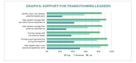 Research by MindTools indicates that half of new managers receive no training before moving into their first management position. So providing support for this transition is critical. Some 87 percent of high-performing organizations take action to support new leaders through their transition, compared to only 38 percent of lower-performing ones. Five specific actions differentiate higher-performing from lower-performing organizations (Graph 6). High-performing organizations develop potential leaders early in their career, provide more advanced leadership skills training throughout their career, help manage their expectations, provide overlap with the previous leader, and mentor during their transition.