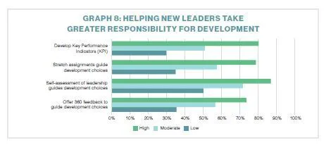 Organizations increasingly are asking leaders to take personal responsibility for their own development. A differentiating factor between high- and low-performing organizations is the level of support they provide to new leaders in accepting this responsibility. Graph 8 shows that high-performing organizations support this effort by making leadership development a key performance indicator (KPI), using stretch assignments to guide development choices and providing 360-degree or self-assessments of leadership skills.