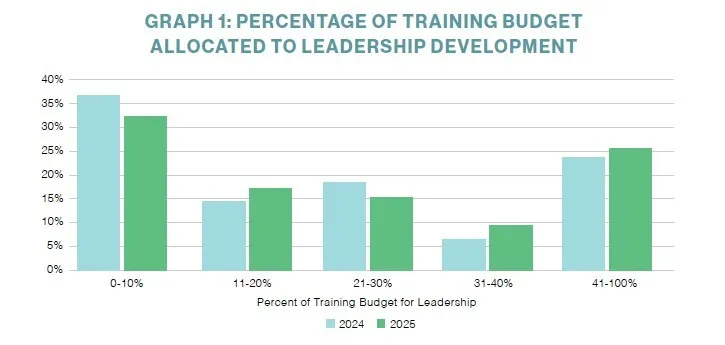 The drop in overall training investment was modestly compensated for by a 1.5 percent increase in the percentage of training investment going to leadership development, perhaps some going toward AI exploration and/or implementation. Graph 1 shows that there was a drop in the number of organizations spending less than 10 percent of their training budget and an increase in those spending 30 percent or more on leadership development.
