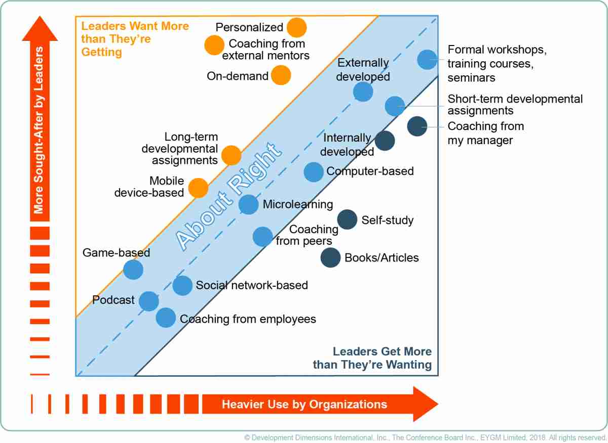 According to the Global Leadership Forecast 2018, published by DDI, The Conference Board, and EY, most mid- to large-sized companies actively use 10 different types of learning. And one-third of all organizations are using 13 or more different types. That’s a lot to manage, and the investment and effort won’t pay off if learning isn’t targeted to how leaders need and want to develop. Here are some tips to strike the balance with a mix of learning methods that will help ensure you get it “just right.”