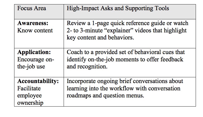So let’s dramatically hack back the manager’s learning support role. Concentrate on just three focus areas (we call them the 3As) with high-impact “asks” of managers and the tools that make it easy for them to step up.