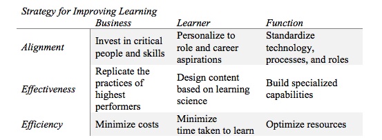 The concepts of alignment, effectiveness, and efficiency have been used for decades as a framework for managing and measuring corporate functions, including Learning. If we look at these outcomes through three lenses—the business, the learner, and the function—we can formulate a strategy for improving corporate learning.