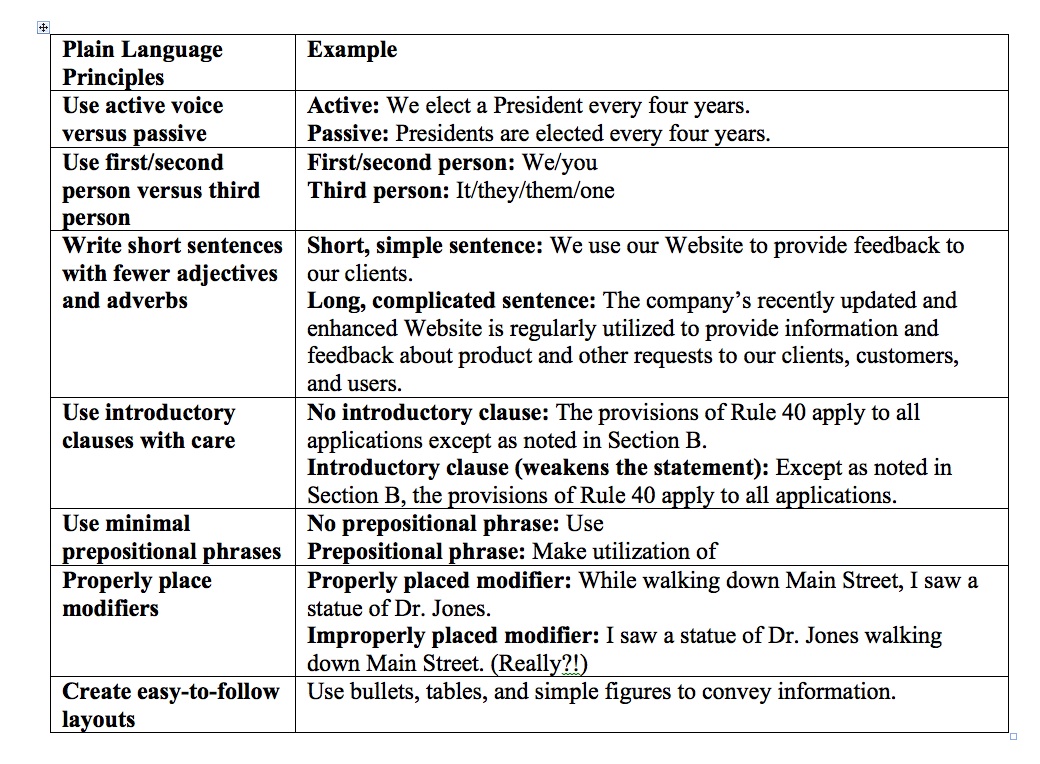 1. Understand and assimilate the principles of plain language. You have written in plain language if your audience can understand what you wrote, what you are trying to achieve, and what you want from them—after a single reading. See the chart below: