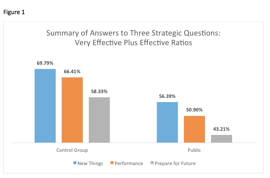 Figure 4 summarizes the aggregated data for answers to the three strategic questions (teaching new things, improving performance, and preparing for the future). We combined the employee-reported perceptions of effectiveness with the amount of time per month employees said they actually spent in training.