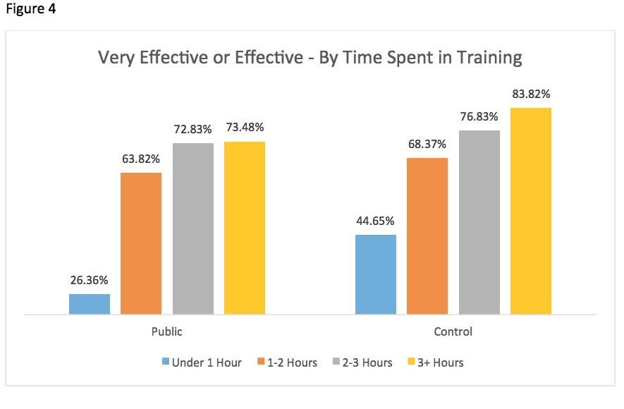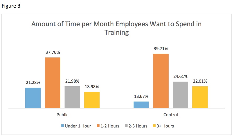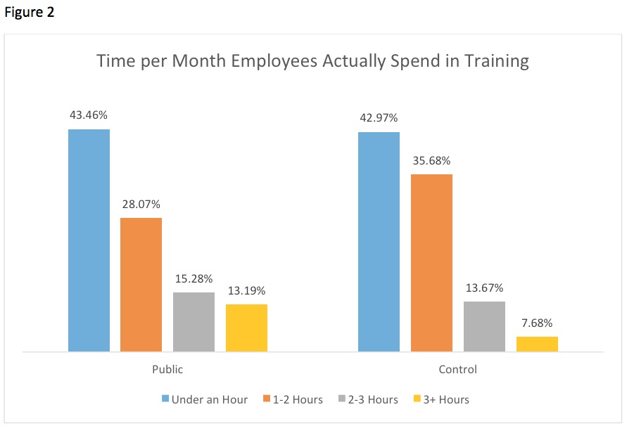 In the public cohort, employees said they spend approximately 17.76 hours per year in training. In the control group, employees spend approximately 16.32 hours per year in training.