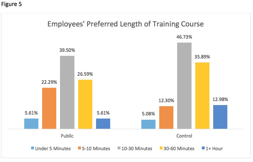 As we hear more and more about micro-learning and the ability of short-form training resources to deliver real results, we wanted to see if employees perceive the benefits of shorter content to the same extent the scientific data tells us they do. Figure 5 illustrates some interesting data about the ideal length of time for training from the employee perspective.