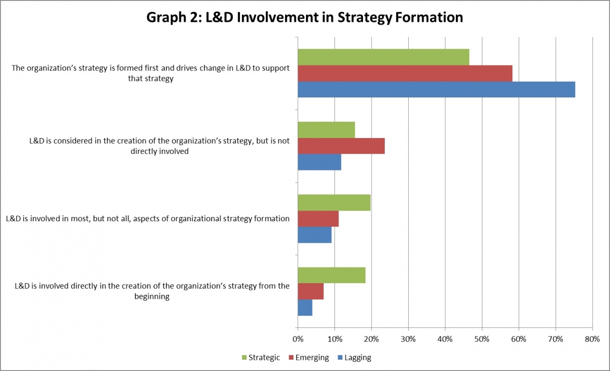 A prime indicator of L&D’s place in the organization is how L&D leaders are involved in the formation of the organization’s strategy. Functions such as marketing, finance, and, more recently, technology, tend to be directly involved in the creation of strategy. We asked our survey respondents to indicate the role the L&D function plays in organizational strategy. The results are shown in Graph 2; the green bar represents results from the organizations identified as Strategic (scoring the highest on the outcomes), while the red and blue bars show the results for the Emerging and Lagging organizations. Overall, only a small proportion (9 percent) indicate that L&D is directly involved from the beginning of organizational strategy formation. Strategic organizations, however, are more than twice as likely (18 percent) than Lagging organizations (4 percent) to directly involve L&D in strategy formation. For both Lagging and Emerging organizations, the majority (75 percent and 58 percent, respectively) indicate that L&D is only involved after the formation of strategy and is focused on ways to support strategy implementation.