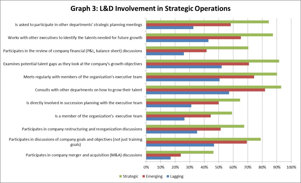 So what are the steps Strategic L&D organizations are taking that differentiate them from Lagging and Emerging organizations? To answer this question, we asked respondents to rate the involvement of the head of L&D in various actions involved in strategic operations. As shown in Graph 3, the results indicate that L&D organizations, in general, play a more passive role in strategic operations (consulting with departments, meeting with executives to help them execute their strategic plans, identifying talent gaps, etc.). Less than half of the respondents indicate that L&D participates directly in strategic discussions (such as mergers and acquisitions) and is part of the executive team in reviewing financial performance or restructuring discussions.