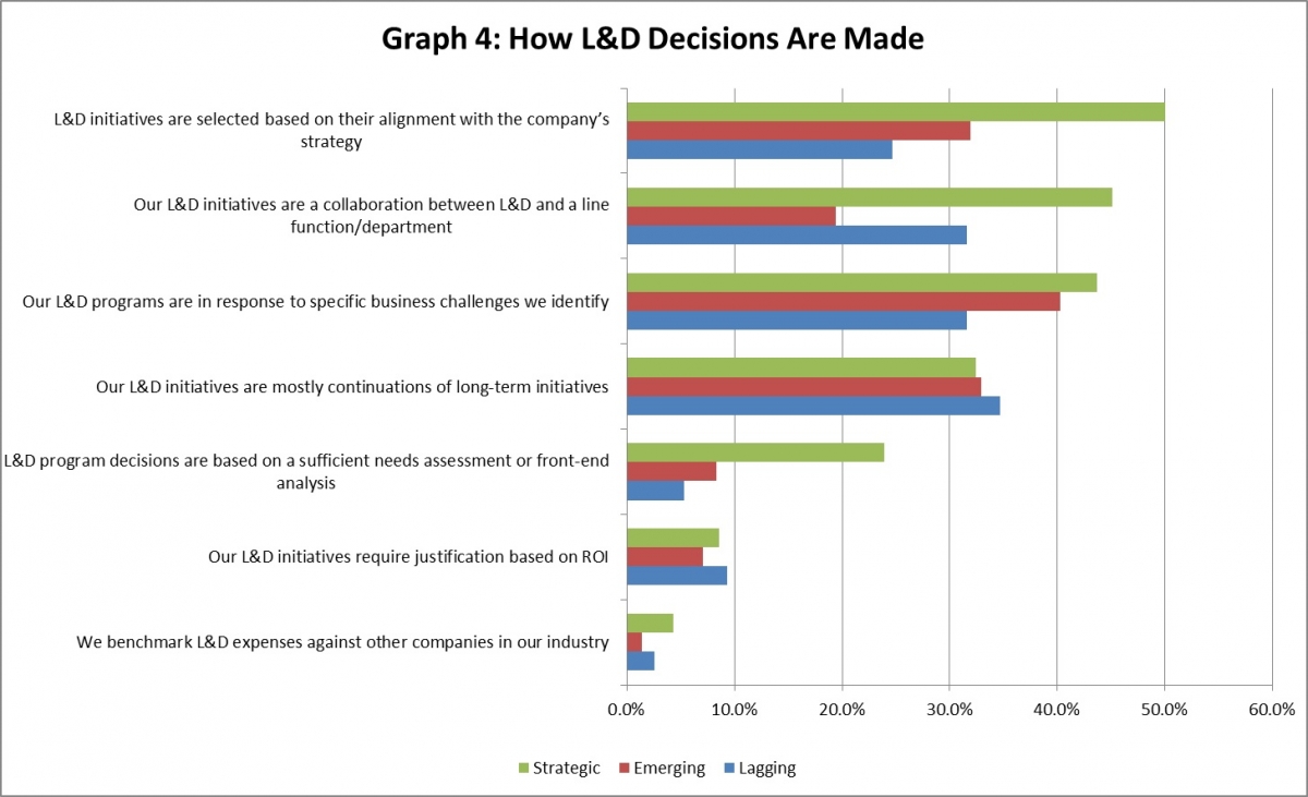 Another key indicator of L&D strategic involvement is how learning and development investment decisions are made. Graph 4 highlights two critical differences between Strategic L&D organizations and Lagging organizations. A higher proportion of Strategic L&D organizations make decisions based on the company’s strategy and in collaboration with a line function than do Lagging organizations. There is also a large difference in the use of needs analysis in L&D decisions, with more than four times as many Strategic organizations as Lagging or Emerging organizations using needs assessment in their investment decisions.