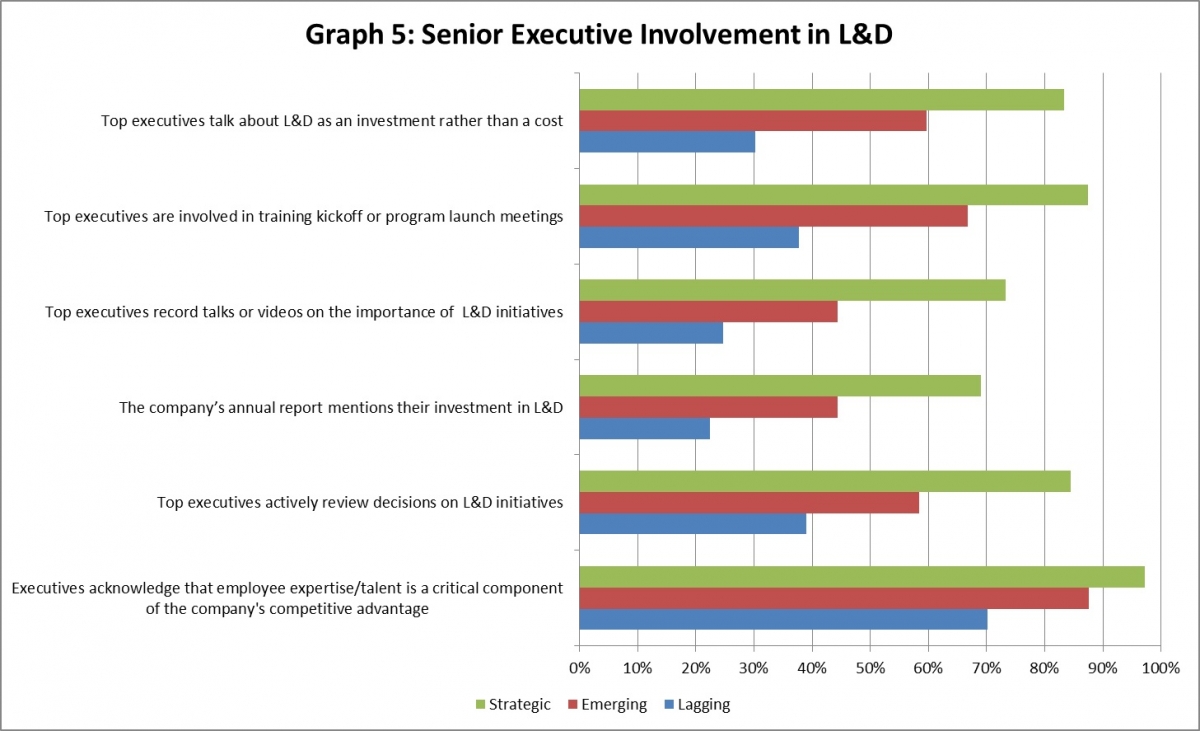 We also asked participants how non-L&D executives become involved in learning and development activities and found significant differences between Strategic, Emerging, and Lagging organizations, as shown in Graph 5. While executives in all organizations are likely to acknowledge that L&D initiatives lead to a competitive advantage, executives in Strategic L&D organizations tend to take a more active role. They are more likely to: