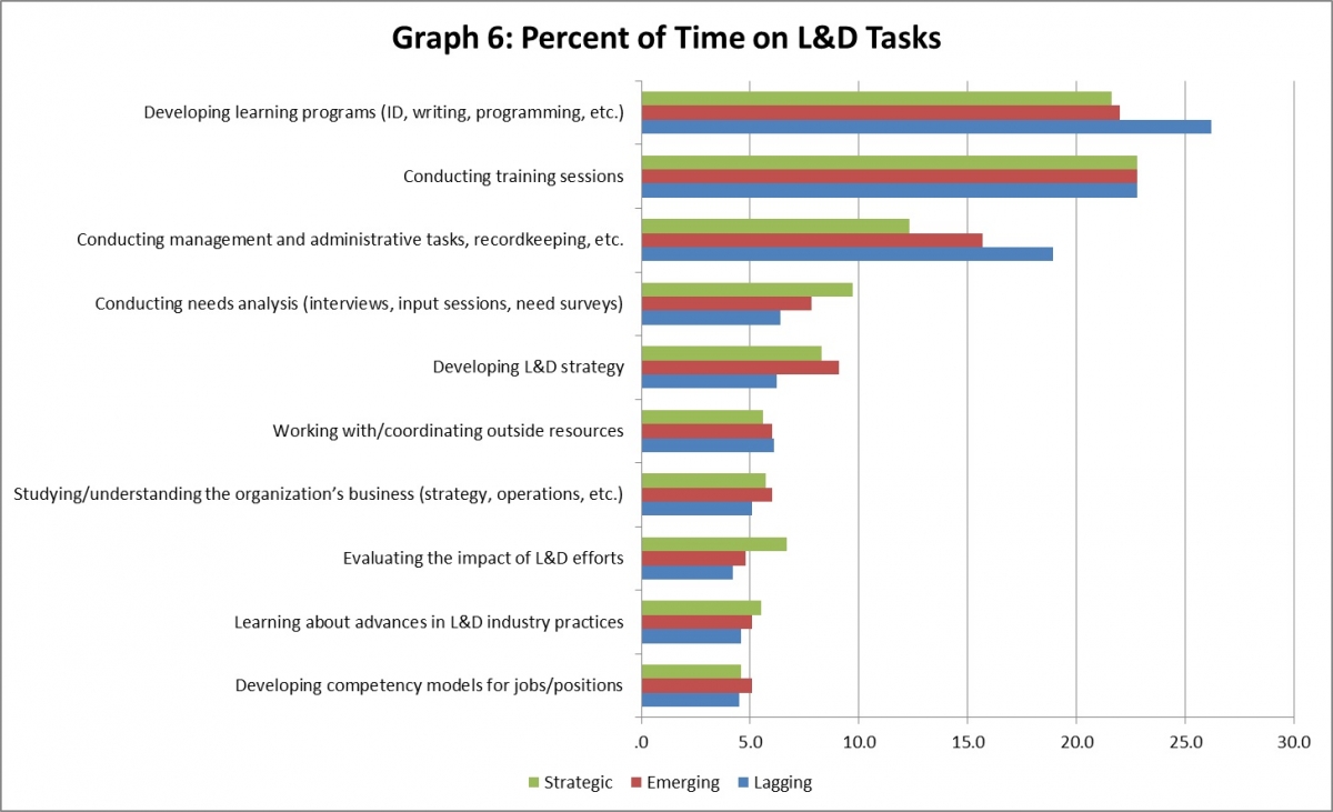 We asked participants to estimate the amount of time they spend on a variety of learning and development tasks; the results are shown in Graph 6. While all organizations spend most of their time developing and delivering learning programs and conducting administrative tasks, there are statistically significant differences among Strategic, Emerging, and Lagging organizations: