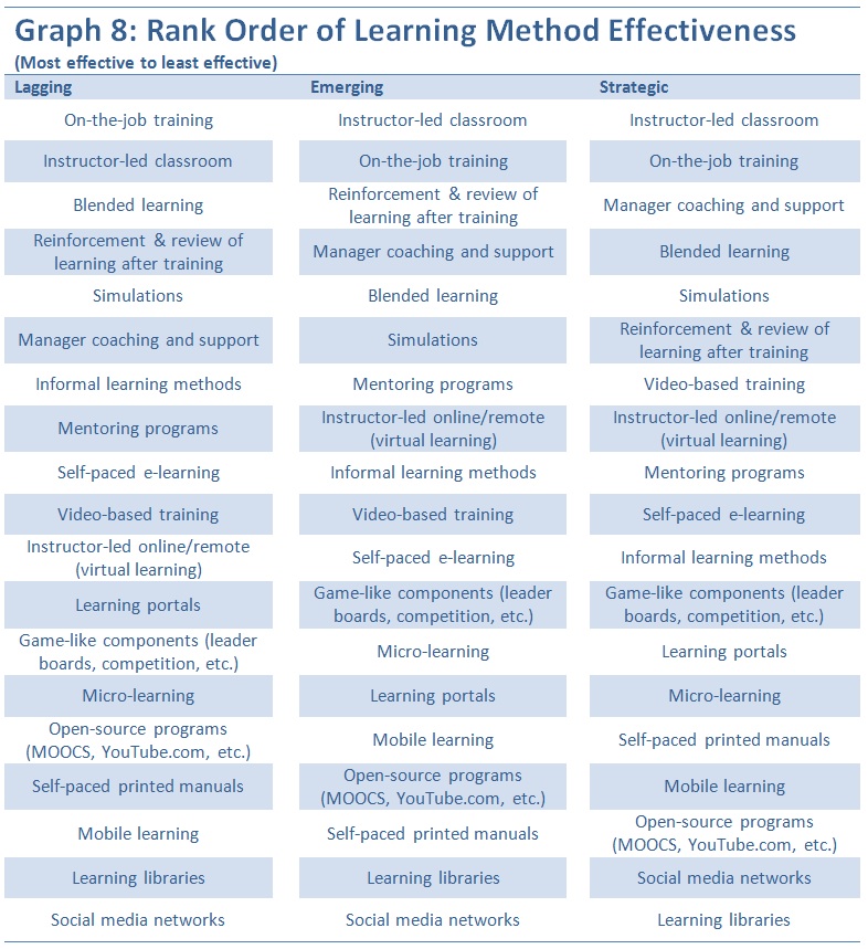 As Graph 7 shows, Strategic organizations make greater use of mobile learning and blended learning than Lagging and Emerging organizations do. In addition, we unexpectedly found that Strategic organizations also make greater use of learning methods that tend to be low cost or free. For example, Strategic organizations make greater use of social media networks and open-source content than do either Lagging or Emerging organizations, despite the fact that both can be accessed with almost no cost.