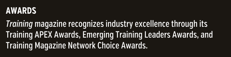 Click each logo to learn more about the APEX Awards, the Emerging Training Leaders awards, and who has been recognized by as favorite training-industry providers in the Choice Awards!