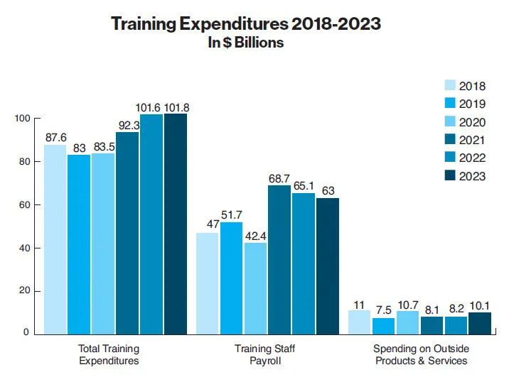 U.S. training expenditures remained steady in 2022-2023, inching up just .2 percent to $101.8 billion. Payroll went down 9 percent, driven primarily by decreases in the payroll of small companies. But spending on outside products and services jumped 23 percent to $10.1 billion. Other training expenditures (i.e., travel, facilities, equipment) ticked up to $28.7 billion from $28.3 billion in 2022.