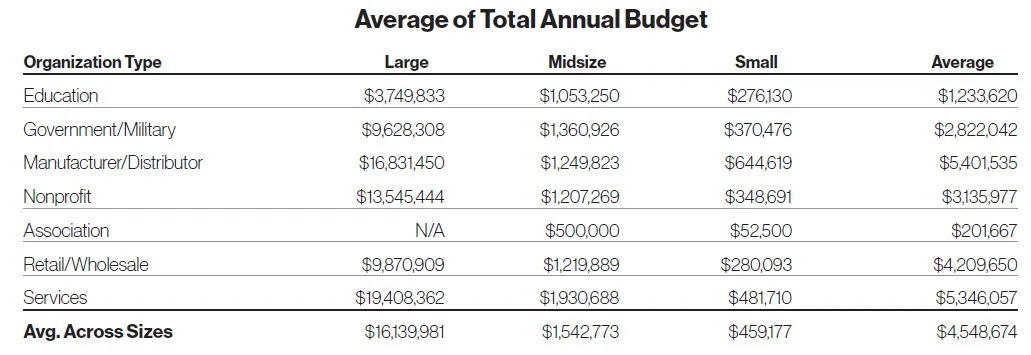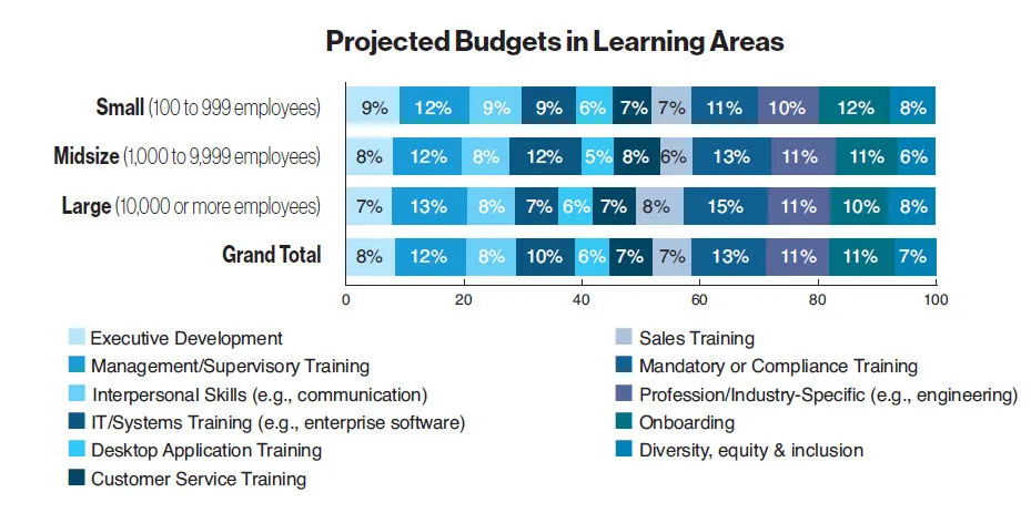 The average training budget for large companies was $16.1 million, while midsize companies allocated an average of $1.5 million, and small companies dedicated an average of $459,177.