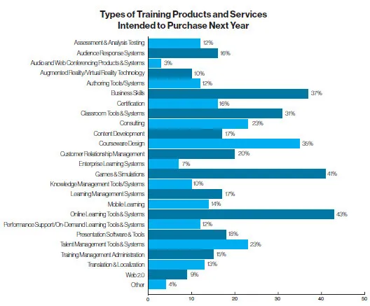 Looking ahead, the most frequently anticipated purchases are online learning tools and systems (43 percent vs. 34 percent last year); games and simulations (nearly double last year at 41 percent); business skills (37 percent vs. 10 percent last year); courseware design (35 percent vs. 19 percent last year); and classroom tools and systems (31 percent vs. 18 percent last year). Learning management systems dropped from 39 percent to 17 percent this year, and authoring tools/systems fell from 36 percent to 12 percent. Content development decreased from 30 percent to 17 percent this year. Augmented/virtual reality tech came in at 10 percent vs. 16 percent last year. Categories receiving less than 10 percent of hits included audio and Web conferencing products/services and Web 2.0.