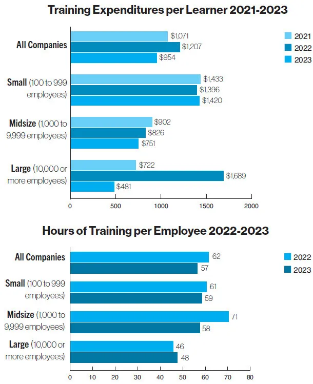 Average training expenditures for large companies decreased from $19.2 million in 2022 to $16.1 million in 2023. The number for midsize companies remained the same at $1.5 million. Small companies rose from $368,891 to $459,177 in 2023.
