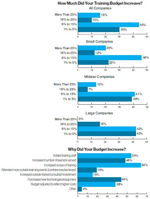 Most of the budget increases were modest—less than 16 percent. Some 44 percent saw increases in the 6 to 15 percent range (vs. 35 percent last year), while 30 percent of organizations reported increases in the 1 to 5 percent range compared with 28 percent last year. Some 26 percent reported increases in the 16-plus percent range (vs. 37 percent in 2022). Most respondents who reported an increase in their training budgets attributed it to the following reasons: