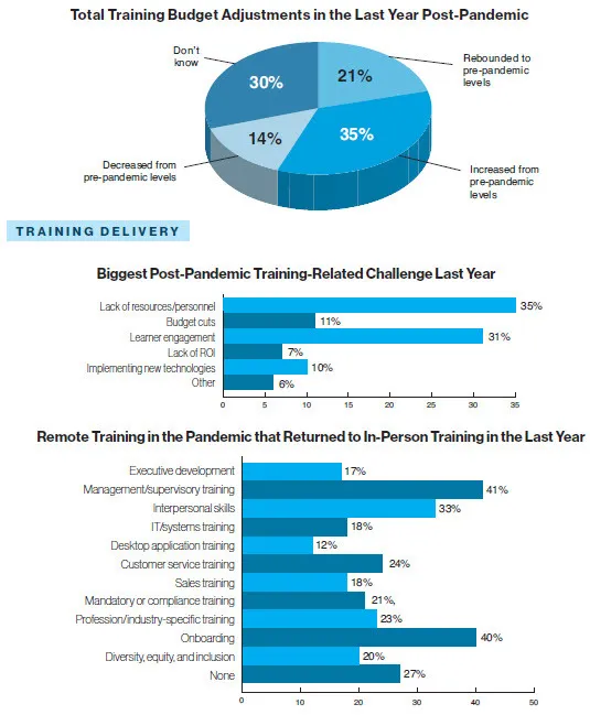 - Some 30 percent of training hours were delivered by a stand-and-deliver instructor in a classroom setting—up postpandemic from 24 percent last year.