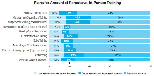 In terms of training delivery in the wake of the COVID-19 pandemic, companies have begun transitioning from remote training back to in-person training for some skills. These include management/supervisory training (41 percent), onboarding (40 percent), and interpersonal skills training (33 percent). Other training returning to some in-person facilitation included customer service training (24 percent); profession/industry-specific training (23 percent); mandatory/compliance training (21 percent); and diversity, equity, and inclusion training (20 percent).