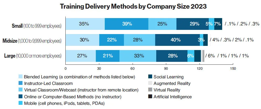 - 4 percent of training hours were delivered via mobile devices, the same as in 2022. This year, 6 percent of training hours were delivered via social learning, the same as last year. Technologies such as augmented reality (.4 percent), virtual reality (1 percent), and artificial intelligence (.4 percent) were not widely used and were slightly less used than in 2022.