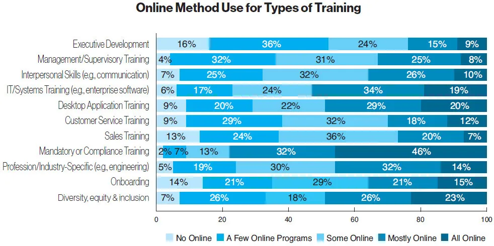 Mandatory or compliance training continued to be done mostly online, with 90 percent of organizations doing at least some of it online and 46 percent entirely online (down from 56 percent last year). Online training also often was used for IT/systems training (78 percent); profession/industry-specific training (76 percent); desktop application training (70 percent); diversity, equity, and inclusion training (67 percent); onboarding (65 percent); management/supervisory training (64 percent); and customer service and sales training (both at 62 percent). Online training was least used for executive development (48 percent).