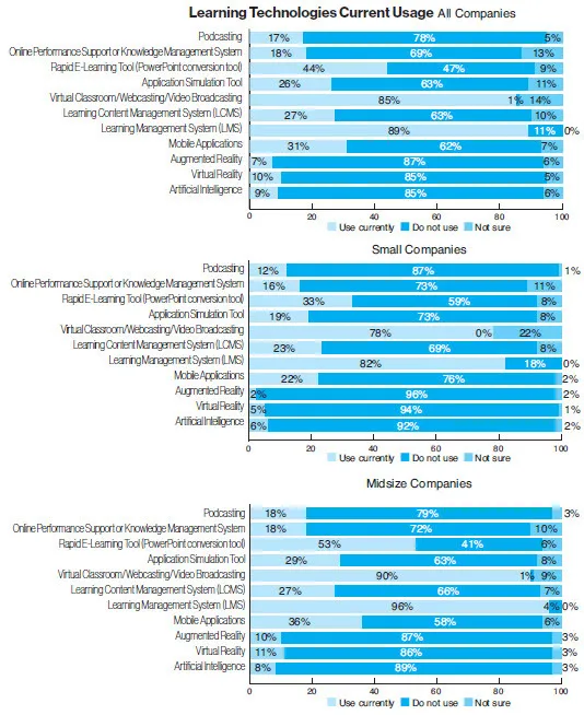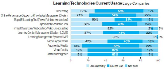 - Learning management systems (LMSs) at 89 percent, the same as last year, followed by virtual classroom/ Webcasting/video broadcasting at 85 percent (down from 86 percent last year). Some 96 percent of large and mid-size companies currently use LMSs vs. 81 percent of small companies.