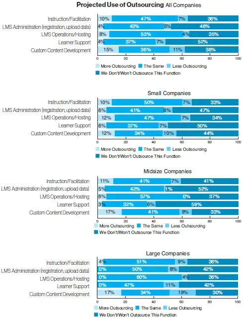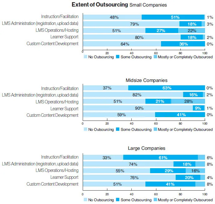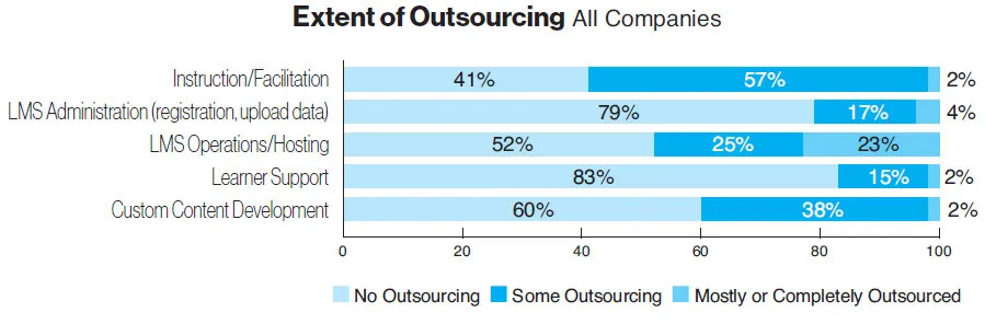 On average, 23 percent of companies mostly or completely outsourced LMS operations/hosting (down from 30 percent last year), while learner support and LMS administration largely were handled in-house (83 percent and 79 percent, respectively).