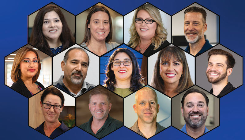 ROSENDIN TRAINING TEAM: Top row, from left: Irma Hurtado, Corporate Trainer; Christi Mayes, Corporate Quality & Compliance Auditor; Kayla Hart, Training Coordinator; and Brandon Floyd, Director of Quality. Middle row, from left: Manuela Granados, Administrative Assistant; Steve Montalvo, Corporate Field QA/QC Manager; Stephanie Roldan, Vice President of Quality and Training; Lisa Vere, former Vice President of Quality and Training; and Connor Greenawalt, Instructional Designer. Bottom row, from left: Robin Van Fossen, Director of Subcontractor and DBE Outreach; Phillip Browning, Training and Development Manager; Jeff Daigle, Workforce Development Training Manager; and Eric Latona, Corporate Field Trainer.